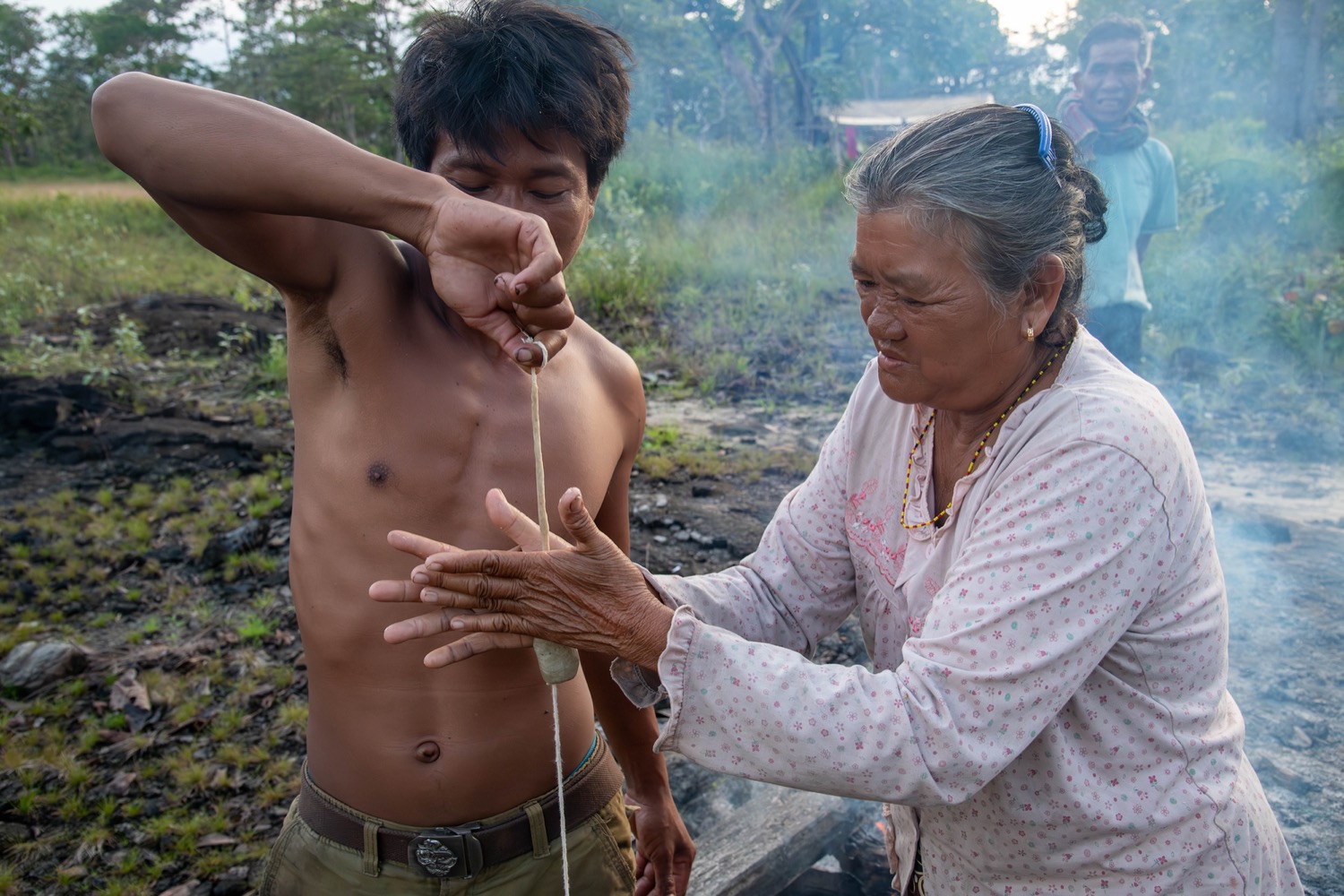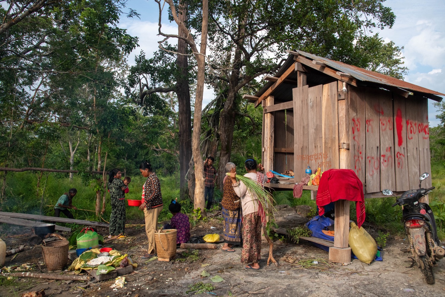 As night fell, I spent the evening documenting their preparations and worship, while the shrine became a flurry of activity. They busied themselves with preparing a pig for the ensuing feast. Their work also included chopping bamboo shoots for Bunong stew and readying wax and bamboo shafts for the ceremony. Once everything was complete, everyone camped at the shrine in hammocks. The forest, central to both ancestor worship and daily foraging, also holds a burial ground.