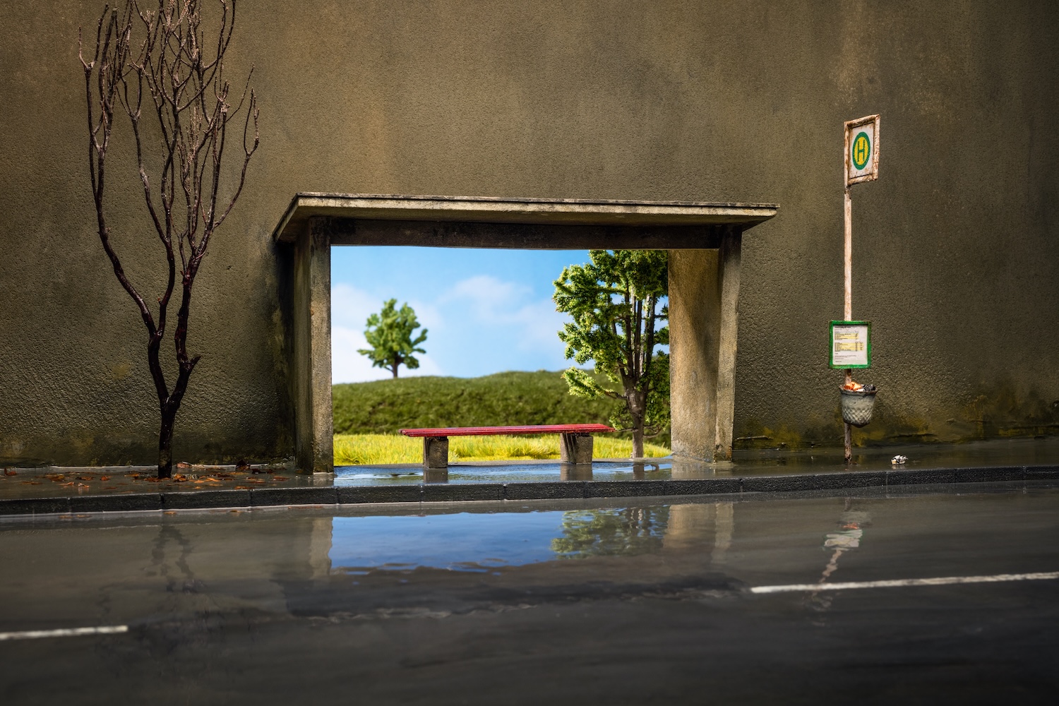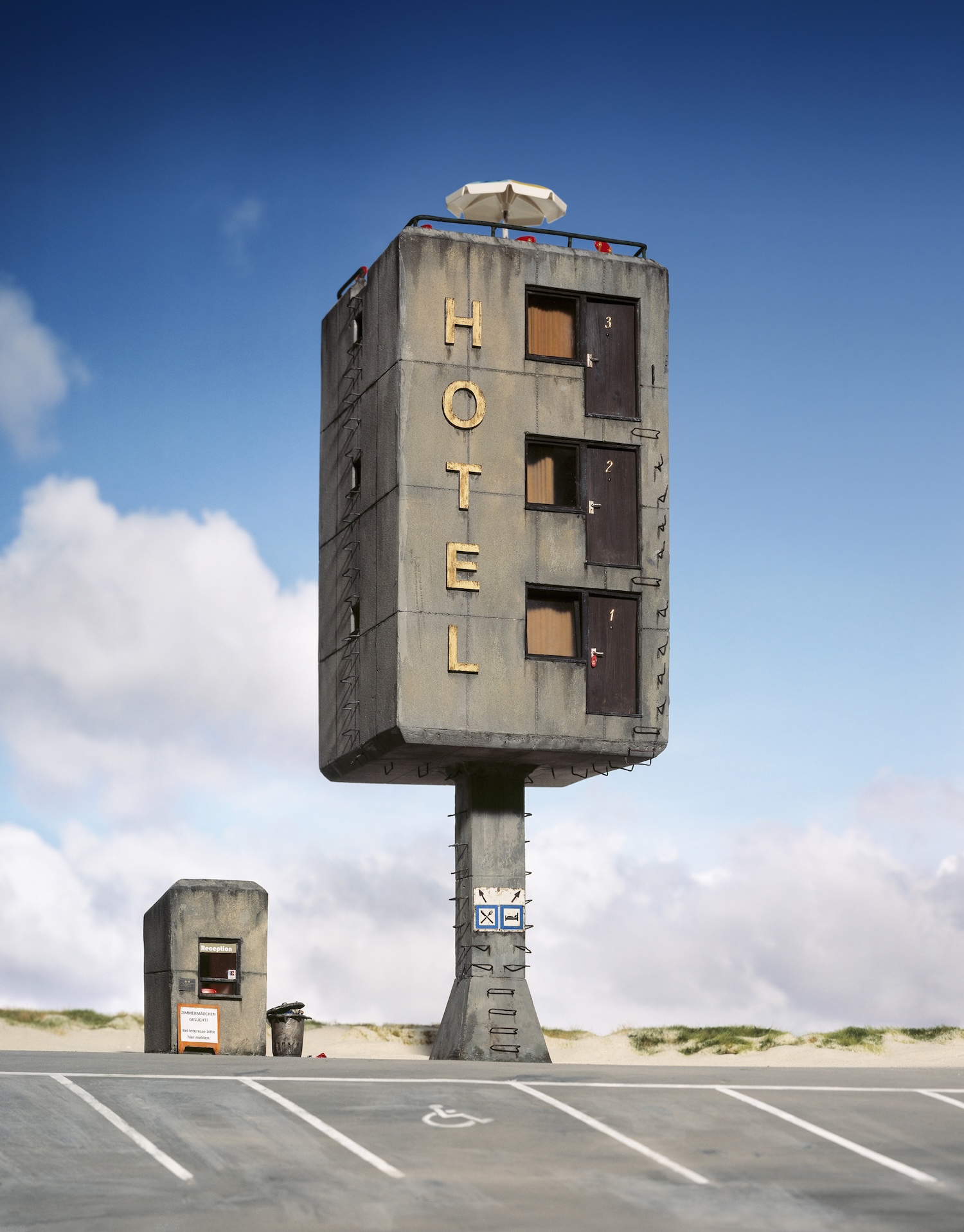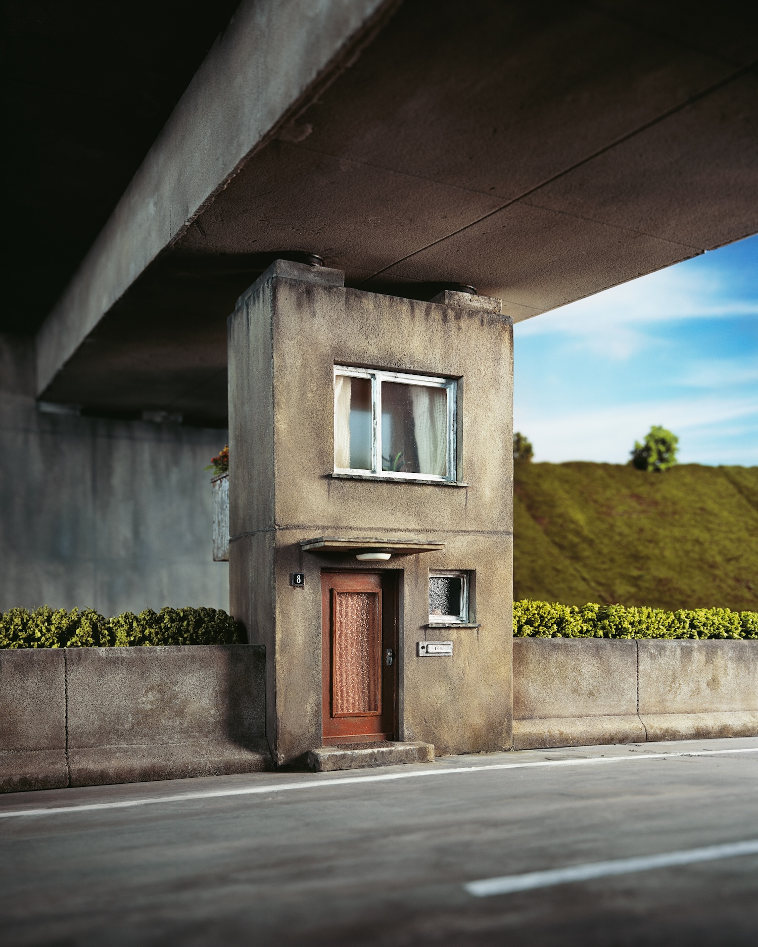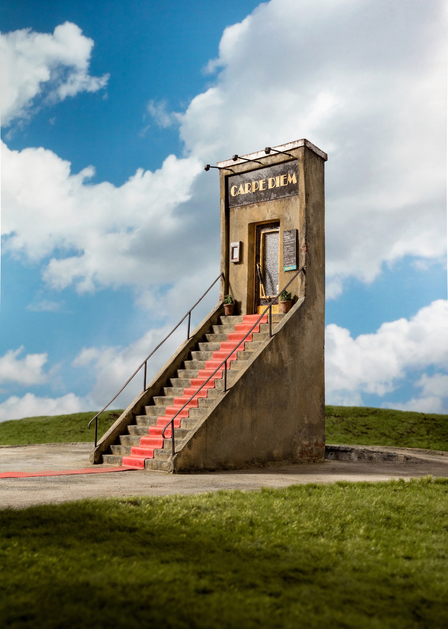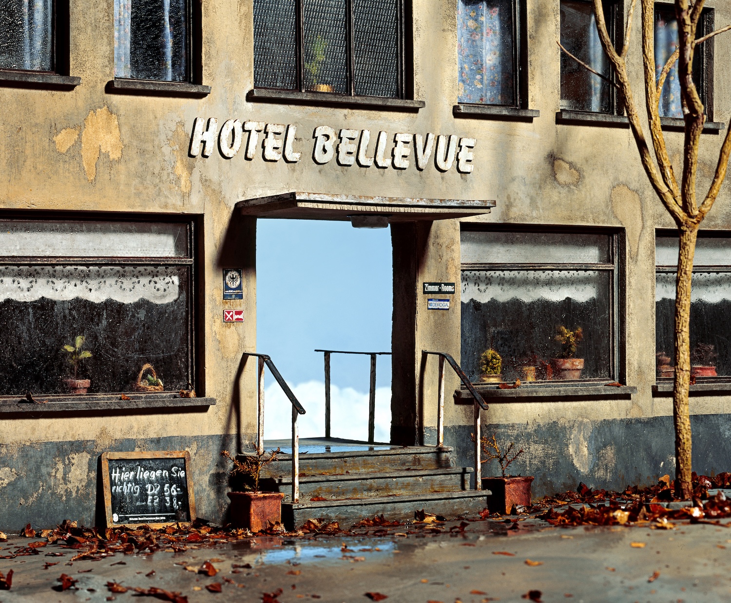 The absurd scenes Kunert constructs in his home studio serve as metaphors for our postmodern, civilised lives, full of insecurities, nostalgia, and efforts to remain happy—or at least to pretend to be so. In the image Hotel Bellevue, the metaphor for the desire to have a joyful holiday is depicted; however, the hotel appears old and neglected. More significantly, the entrance leads to an empty space, an abyss where happiness feels insecure or even absent. “My photographs are like stage sets that you can play with your own thoughts and fantasies. In the scenes, I often show houses that are getting on in years, on which the ravages of time have gnawed and continue to gnaw. Nevertheless, they still stand there with their sometimes-fragile charm and a certain pride—at least that's how I feel. Life in and around them seems to work somehow.”