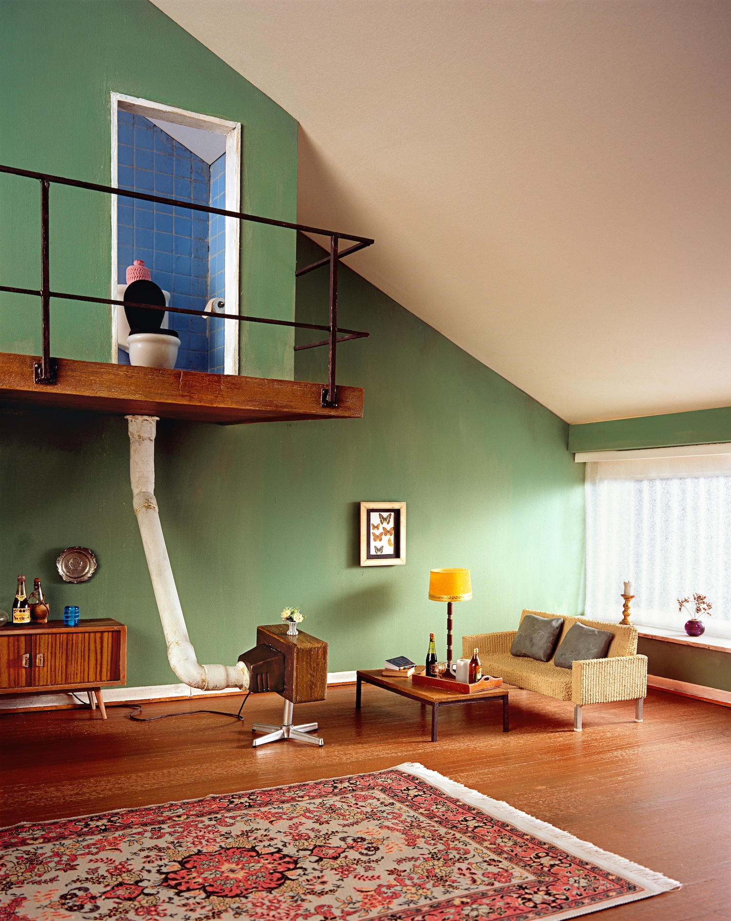 Frank Kunert uses a miraculous blend of dystopian fantasies and dry humour in his work. His photographs — or, more accurately, his miniature constructions of external reality — serve as a clear reflection of his worldview. His humour functions as an antidote to the bitterness of modern life. In Room with a View, we see a 1950s interior with a stretched sofa that leads to a diving board of a swimming pool. The present moment feels safe, but what the near future holds is uncertain happiness, if happiness at all. “People search for happiness, sometimes they find it, only to lose it again from one moment to the next - or very gradually, almost imperceptibly. And with all the small and large catastrophes that we encounter, a certain distance helps us to bear the dystopian aspects of our world. In the long run, the seriousness of life is only digestible with a pinch of humour.”